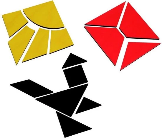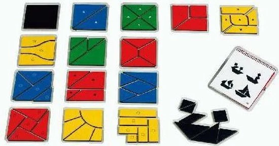 Met de 16 quadranten moeten andere vormen worden gemaakt. Het begint met 2 vormen en eindigt met een 7-delig quadrant, het Chinese Tangram. Een boekje met vele mooi vormgegeven voorbeelden geven de kinderen steeds moeilijker wordende opgaven. Durft uw kind de uitdaging aan?