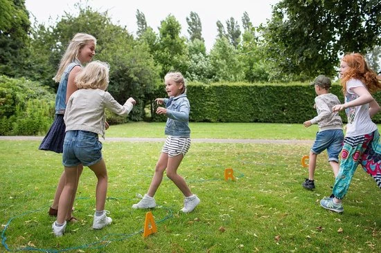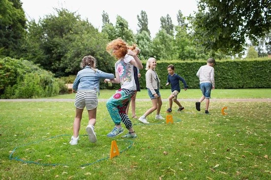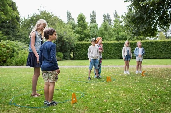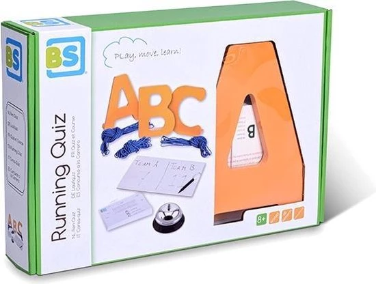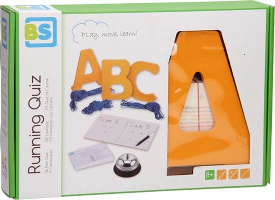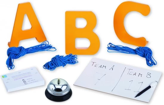 - Inclusief 3 houten letters, 3 touwen om het veld te markeren, 1 bel, 1 scorebord met stift & quizkaarten in 6 talen