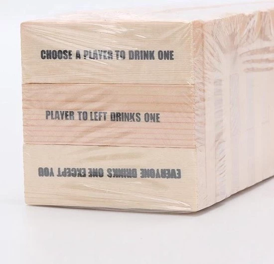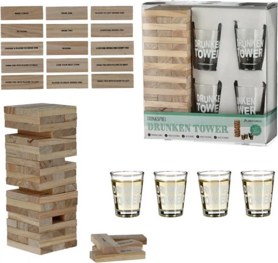 Het spel bestaat uit zestig houten Drunken Tower blokjes met daarbij 4 shotglazen.