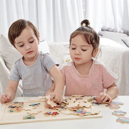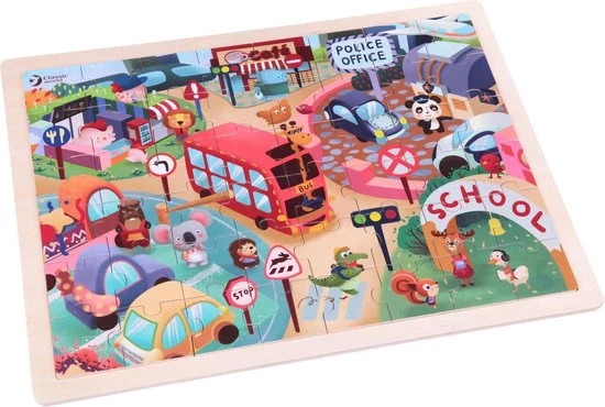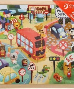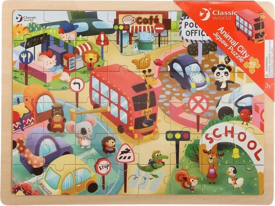 Klassieke wereld houten puzzel Animal City- de set bevat 48 elementen . De puzzelstukjes passen in een handig frame. Gedetailleerde illustraties met levendige effecten stimuleren de fantasie van peuters tijdens het rangschikken van de stukken. Zie hoe de helden leven, leren en werken door de volgende puzzelstukjes te rangschikken!