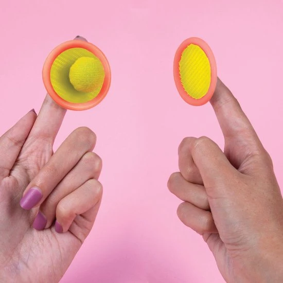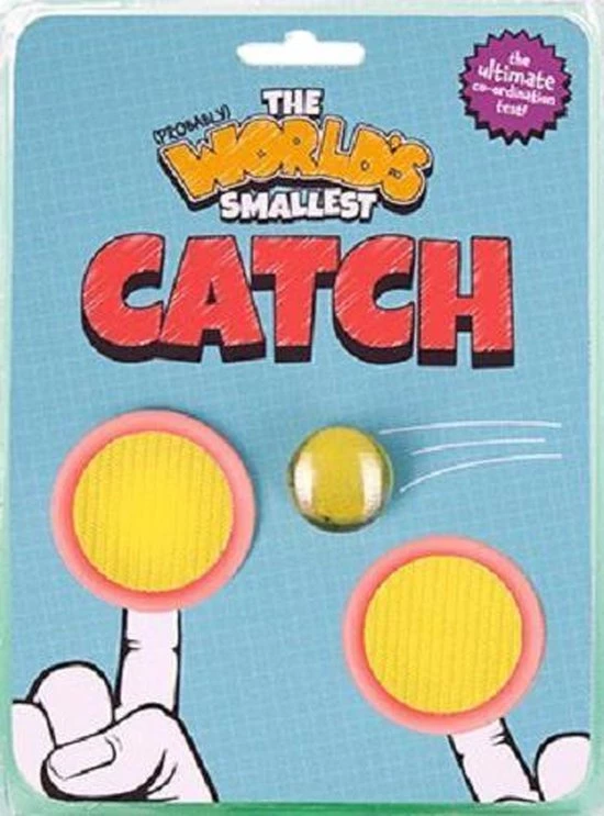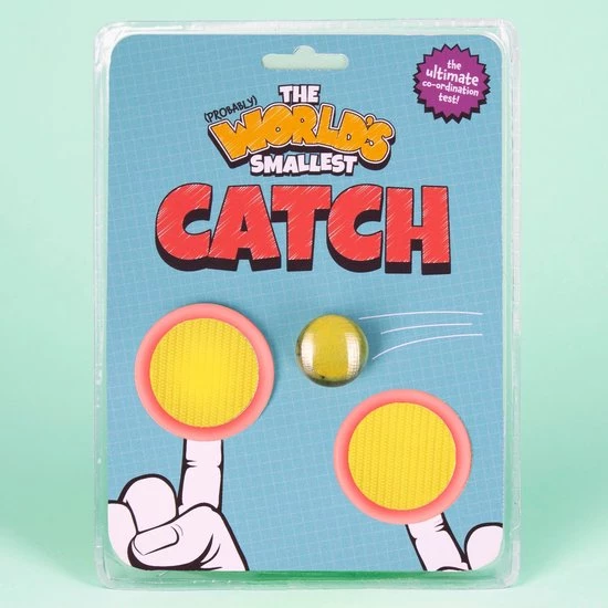‘s Werelds kleinste vangspel van Fizz. Het allerkleinste vangspel ter wereld. Gooi de kleine bal naar elkaar en vang hem met het vangbordje met klittenband. Spel wat je vroeger op het strand of in het park deed. Met twee bordjes en één balletje. Diameter vangbordje: 5 centimeter. Diameter bal: 2,3 centimeter.