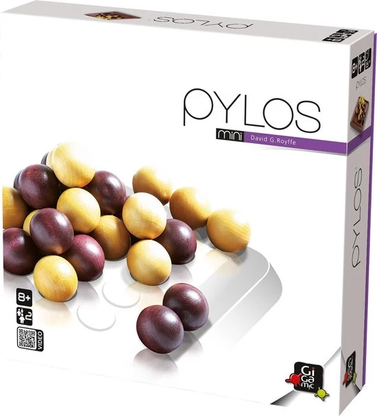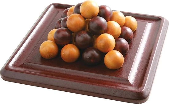 Pylos: van op deze piramide…. De 2 spelers krijgen 15 knikkers en leggen ze beurtelings in de vorm van een piramide. Met eenvoudige principes kan men knikkers uitsparen: de zuinigste speler wint door de laatste op de top te leggen.