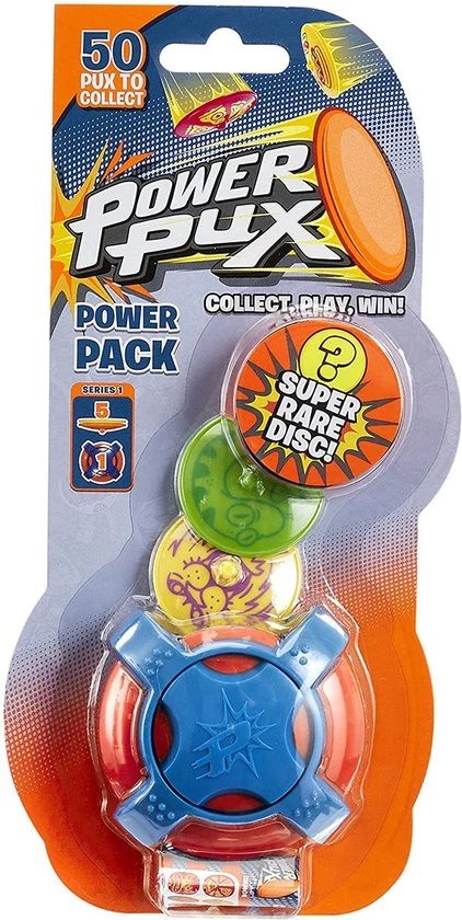 Daag jouw vrienden nu uit met Power Pux. Speel en ruil je discs om je collectie te vergroten. Er zijn 50 verschillende Power Pux, verzamel ze allemaal en word een Power Pux master! Dit pakket bevat gegarandeerd een zeer zeldzame disk!