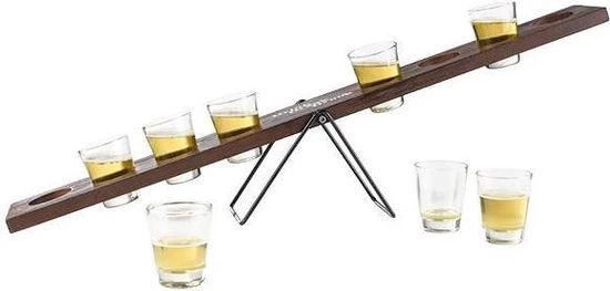 Maak een feest compleet met dit leuke behendigheidsspel. De wip met de glazen moet in balans blijven. De glazen kunnen gevuld worden met drank maar uiteraard ook met limonade.