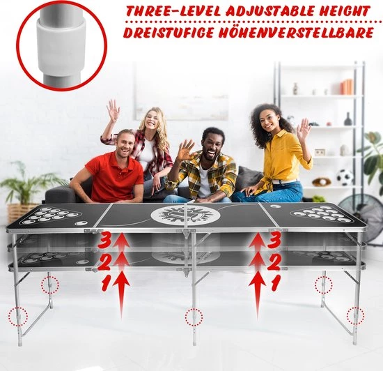 Praktisch en all-inclusive: bierpongtafel met drie verschillende hoogte-instellingen, levering inclusief pongballen, bekers, twee bekerhouders en een ballenhouder.
