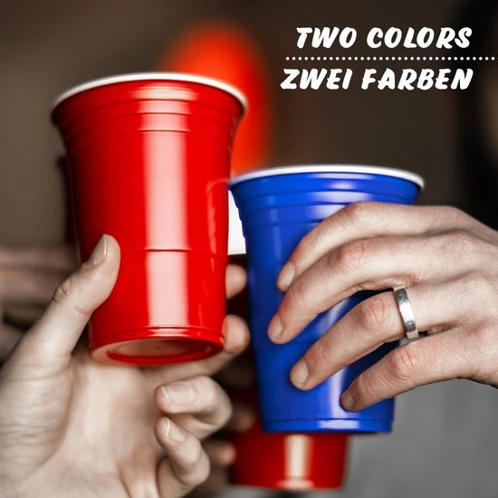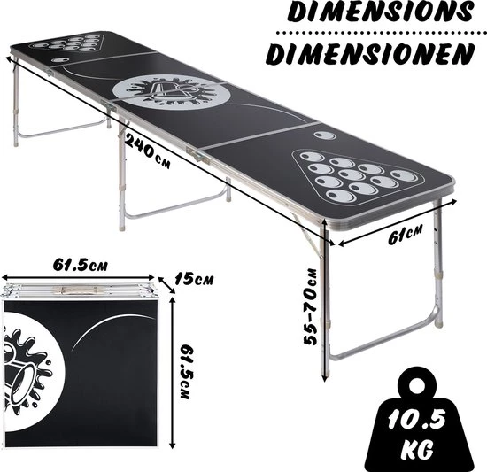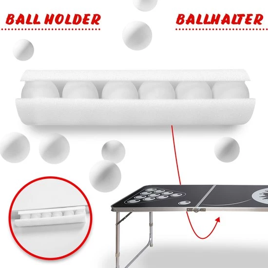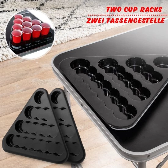 - De set bevat een bierpongtafel, 100 plastic bekers, 6 pongballen en twee bekerhouders.