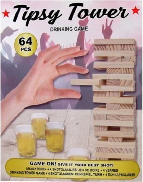 ? Valt deze om als jij er een blokje uit hebt gehaald? Dan ben jij degene die het shotglaasje leeg moet drinken!!