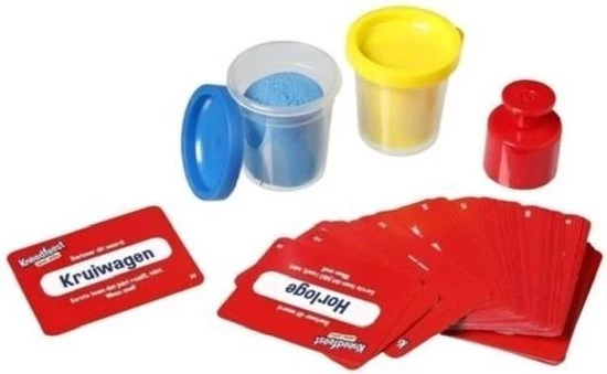 | Verpakkingsinhoud | 2, potjes, klei, (blauw, en, geel), 1, stempel, 50, kaarten, spelregel. |