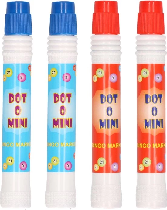 4x Bingostiften in de kleuren: blauw en rood. Van beide kleuren 2x stuks. Met deze handige bingo stiften zet u snel en makkelijk stippen op de nummers met bingo. bestaande uit 2x Bingostift rood, 2x Bingostift blauw Let op: dit is geen speelgoed en niet geschikt voor kinderen.