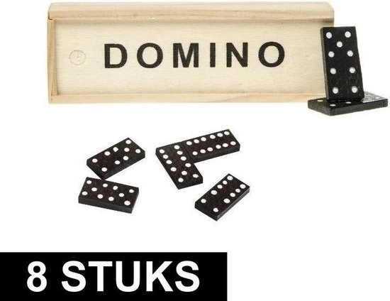 8x Domino spel in houten kistje. Klassiek domino spel in houten kistje. Het houten kistje bevat 28 dominostenen. Het formaat is ca. 15 x 5 x 3 cm groot. Handig om bijvoorbeeld mee te nemen op reis.