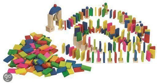 200 Bontgekleurde en stand zekere houten dominostenen, 40 houten elementen om hoogteverschil te kunnen cre?ren, 6 molentjes en 1 eindpunt met belletje.