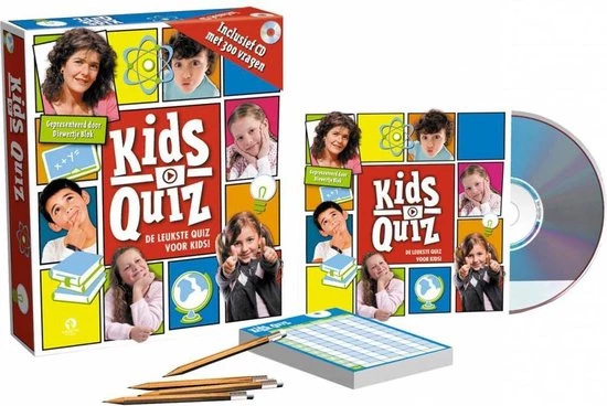 Inhoud: cd met meer dan 300 verschillende vragen, blocnotes met 4 potloden, spelregels met antwoordboekje.
