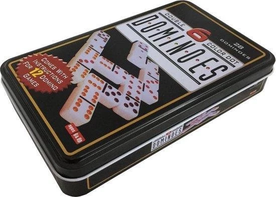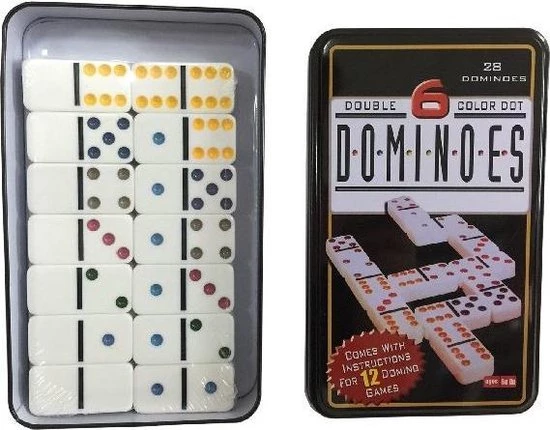 Domino speelset, met 28 dominostenen. Leg je speelstukken neer in lange rijen, en probeer de eerste speler te zijn die al zijn stenen kwijtraakt. De gekleurde stippen op de stenen maken het spel gemakkelijker te spelen. De set bevat 28 dominostenen en spelregels voor 12 spelvariaties. Wordt geleverd in handig blik. Geschikt voor kinderen vanaf 6 jaar.