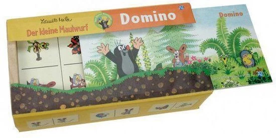 prachtig Domino-spel met houten plaatje met daarop Molletje en zijn vriendjes van de bekende Tsjechische tv-serie, in houten doos met schuifdeksel