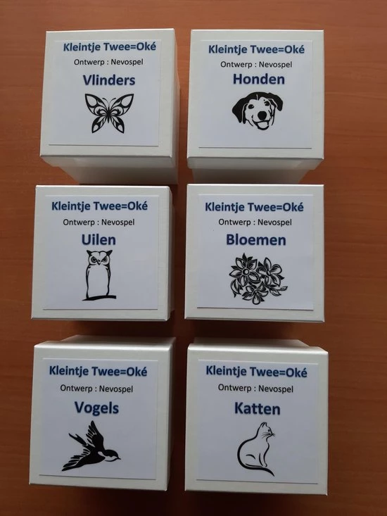 Kleintje Twee=Oke is een compact memoryspel van 28 kaarten met foto?s. De kaarten zijn 3mm dik, 9,5 x 9,5 cm en aan beide zijden afneembaar. Met name geschikt voor mensen waarbij de fijne motoriek niet meer is zoals wenselijk zou zijn.