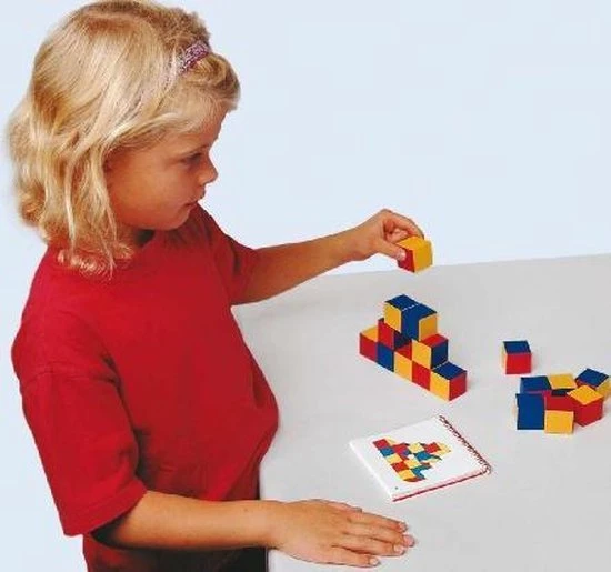 Met de 27 gekelurde blokken moeten voorbeelden worden nagebouwd – van 2 naar 3 dimensionaal. Een boekje met mooi vorm gegeven voorbeelden geven de kinderen steeds moeilijker wordende opgaven.