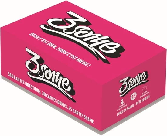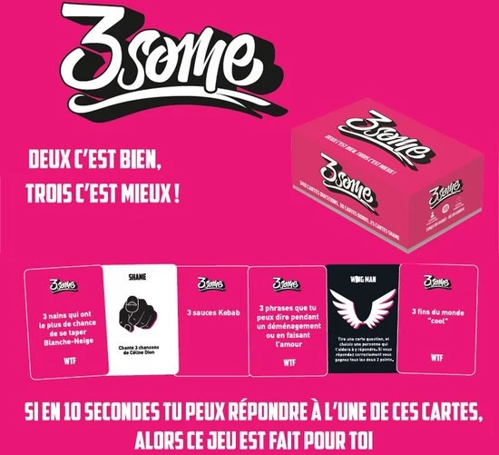 D?couvrez le jeu 3some, un jeu d’ambiance pour jouer entre adultes et entres amis pour passer des soir?es m?morables et qui promet des heures de rires. Les 10 secondes qui vont changer ta relation avec tes potes.
