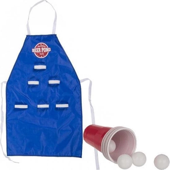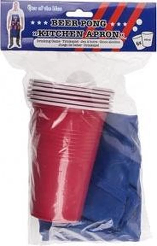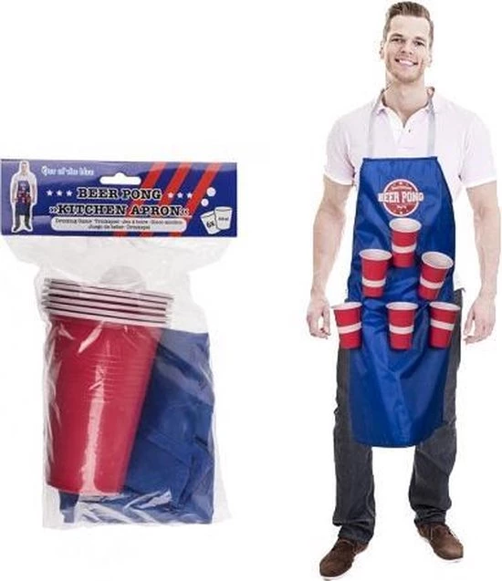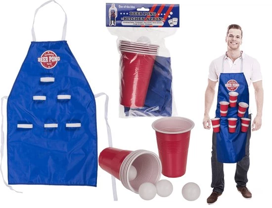 | Verpakkingsinhoud | 1x, keukenschort, 6x, bekertjes, beerpong, 4, ping, pong, balletjes |