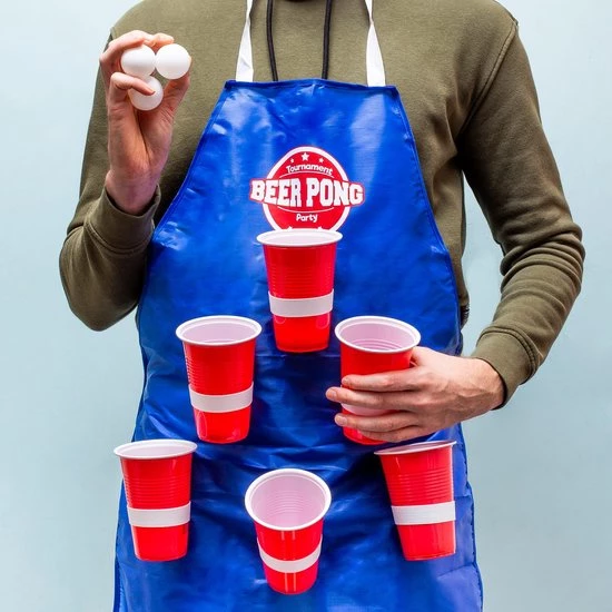 De meest unieke manier om het drankspel beer pong te spelen, met een keukenschort! Een van jullie trekt het keukenschort aan en de rest probeert de cups te raken. Maak het extra lastig door te bewegen.