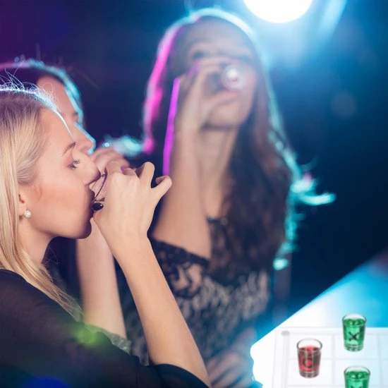 Met dit grappige drinkspel zorg je voor een geweldige stemming op het volgende feestje. Gespeeld wordt het met zijn twee?n. Hier kan je zelf bepalen, wanneer gedronken moet worden. Voor elke beurt, enkel de verliezer of slechts de winnaar mag drinken. De kleine shotglaasjes zijn ideaal voor verschillende likeuren en drankjes. Na het feest kunnen de glaasjes in de vaatwasmachine geplaatst worden.
