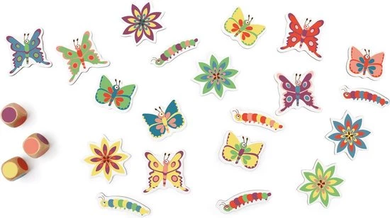 Werp de 3 dobbelstenen en ga opzoek naar een vlinder, bloem of rups met deze kleuren.