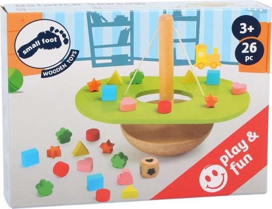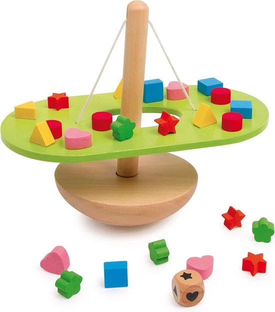 Vrolijk geduldsspel voor het stimuleren van de fijne motoriek. Het doel van het spel is om de vormen op de wip zo te plaatsen, dat de wip in evenwicht blijft en de speelstenen blijven staan. De dobbelsteen bepaalt welke vorm steen je op de wip mag plaatsen.