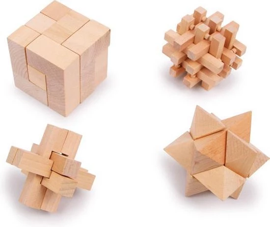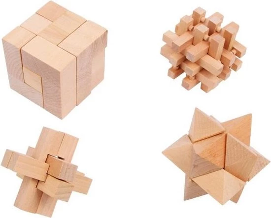 Set van 4. Hier worden hoofden en vingers uitgedaagd ? deze knobelpuzzels hebben het in zich om de spelers te fascineren! Spannende spellen van zorgvuldig en goed passend vervaardigd massief hout oefenen de logistiek en het ruimtelijk denken. 4 verschillende.