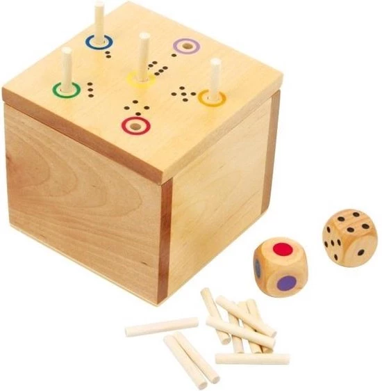 Een opwindend houten insteekspel, waarbij strategisch nadenken een must is. Hier komt het niet alleen aan op geluk bij het gooien met de dobbelsteen! Er kunnen verschillende varianten met kleur- of ogendobbelstenen worden gespeeld.