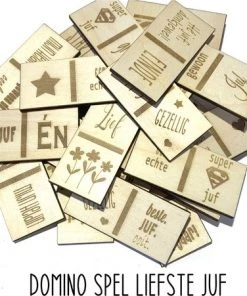 Wil je een origineel cadeau geven aan je JUF? Geef eens een domino spel cadeau.(afmetingen steentje 7×3,5cm) 28 stuksVerpakt in een doosje met tekst: Voor de liefste juf. (afmetingen doosje 20x10x2cm)