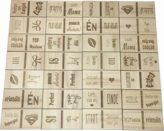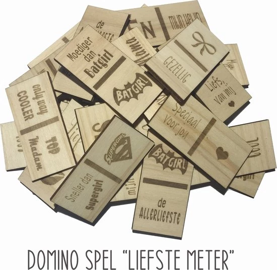 Wil je een origineel cadeau geven aan je Meter? Geef eens een domino spel cadeau.(afmetingen steentje 7×3,5cm) 28 stuksVerpakt in een doosje met tekst: Voor de liefste Meter. (afmetingen doosje 17x8x2cm)