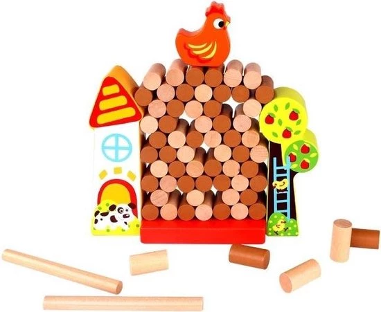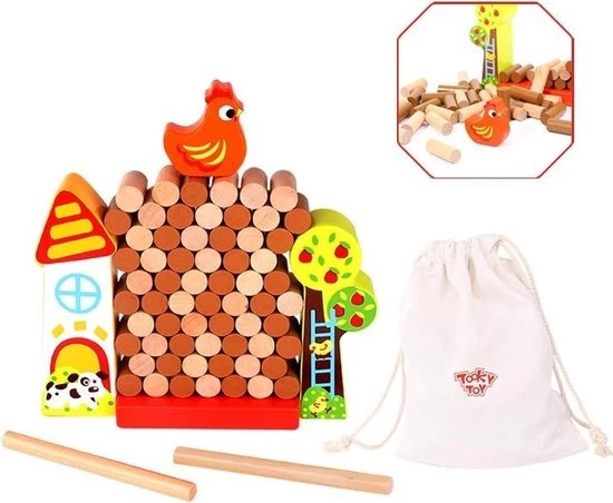 Zorg met dit houten kinderspel dat de kip ?op stok? blijft zitten. Leg alle meegeleverde stokjes tussen het frame en zet de kip er bovenop. Duw nu om de beurt een stokje er tussenuit met de lange meegeleverde stokken. Wanneer de kip ?van stok? valt heb je verloren. Vanaf 3 jaar.