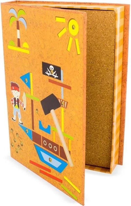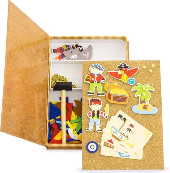 Doos met een hamertje, onderdelen en nageltjes om piratentaferelen mee te timmeren.