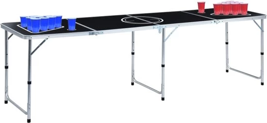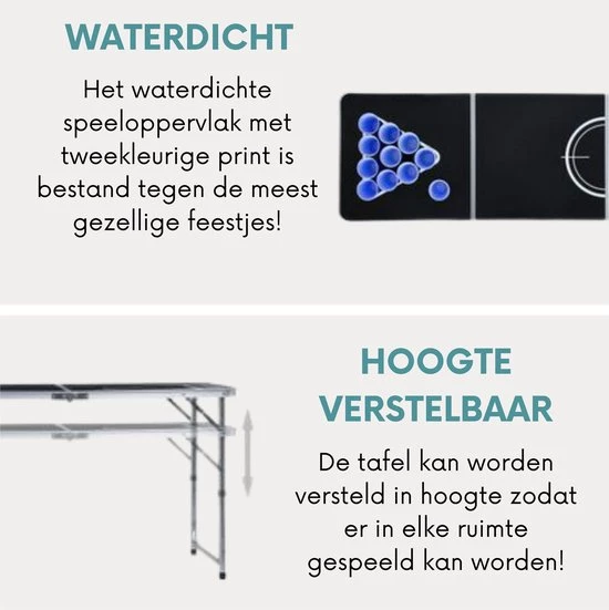 Deze tafel is stevig en heeft een lichtgewicht, aluminium frame waardoor hij binnen enkele seconden opgezet en ingeklapt kan worden. Hij is zeer stabiel en duurzaam. Het waterdichte speeloppervlak met tweekleurige print is bestand tegen de meest ruige feestjes.